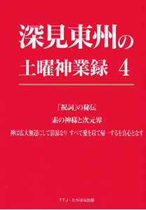 深見東州の土曜神業録4(Vol.1) 2026.01.09 目次 目次【第一章】「祝詞」の秘伝(昭和59年8月4日)【第二章】素の神様と次元界(昭和59年8月22日)【第三章】神は広大無辺にして清涼なり すべて愛を以て帰一するを真心となす(昭和59年8月25日) 目次 【第一章】「祝詞」の秘伝(昭和59年8月4日) □ 祈りとは ■ 高天原の意味 □ 神魯伎神魯美 ■ 祓戸の神様とは □ 「罪けがれ」は祓えばよい ■ 祝詞の活用法 【第二章】素の神様と次元界(昭和59年8月22日) ■ 四次元は心の世界 □ 五次元以上は神様の世界 ■ 六次元から上の世界とは □ 念を残すとどうなるか ■ 天意の転換 □ 素の神様とは ■ 愛を説いたイエスの革新性 □ 観音様は三十三相に化身する 【第三章】神は広大無辺にして清涼なり すべて愛を以て帰一するを真心となす(昭和59年8月25日) □ 神は広大無辺 ■ 愛を以て帰一する □ 真心とは ■ 神人合一の実践ポイント