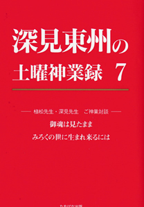 深見東州の土曜神業録7(Vol.1) 2026.01.09 目次 目次【第一章】御魂は見たまま(昭和59年10月6日)【第二章】みろくの世に生まれ来るには(昭和59年10月6日) 目次 【第一章】御魂は見たまま(昭和59年10月6日) 【植松先生・深見先生ご神業対談:その一】 □ 御魂は見たまま ■ 悟り、差とり、覚り □ 「かごめの歌」は時代を教えていた ■ 予言は変わる 【第二章】みろくの世に生まれ来るには(昭和59年10月6日) 【植松先生・深見先生ご神業対談:その二】 ■ 白山様の神仕組 □ 「菊理の働き」の真意 ■ 北極神界は御魂の教育機関 □ みろくの世に生まれる権利