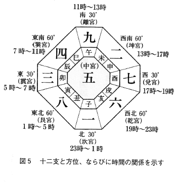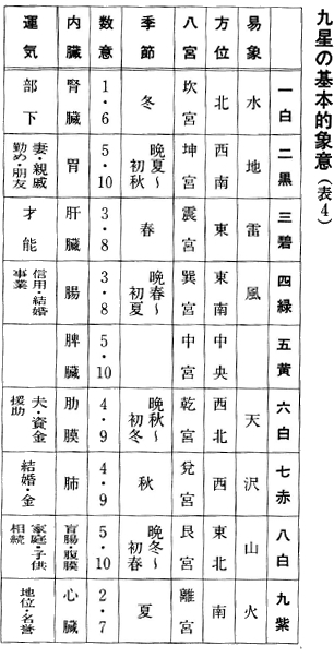 複雑な見方の中から、九宮を取り出し、それを基本として、陰陽五行説、干支学(十干十二支)や易の八卦などを組み合わせて作ったものです。
