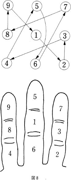練習方法としては、手のひらの、人指し指、中指、薬指の三本の指の節目の間に数字を書いて、親指の先で一から九まで順に追っていきます。理屈はともかく、この動きを反射的に身に付けてしまうことです。