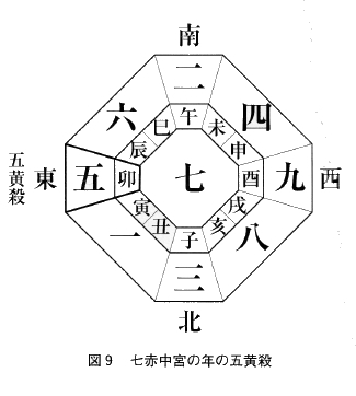 ①五黄殺=年盤・月盤・日盤において五黄土星が回っている方位。