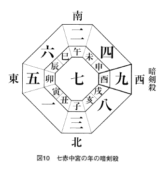 五黄土星が回っている方位の反対側が「暗剣殺」で、これもすべての人にとって最高度の凶方位となります。