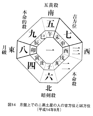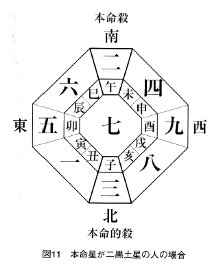 月盤や日盤でも、自分の本命星が回座している方位は本命殺です。月盤を見る場合でも月命星ではなく、生まれ年の本命星で見ますので注意してください(一七一ページの「月命殺」と混同しないように)。