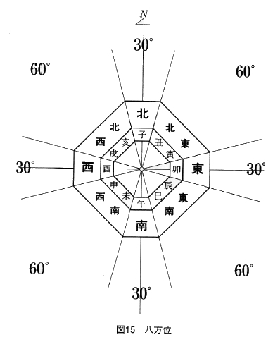 八方位の範囲は前章で述べたように、東西南北は各30度。その間の東北、東南、西南西北は、それぞれ60度の範囲となります。